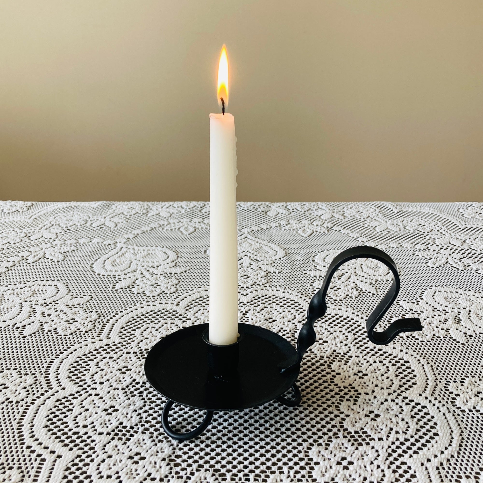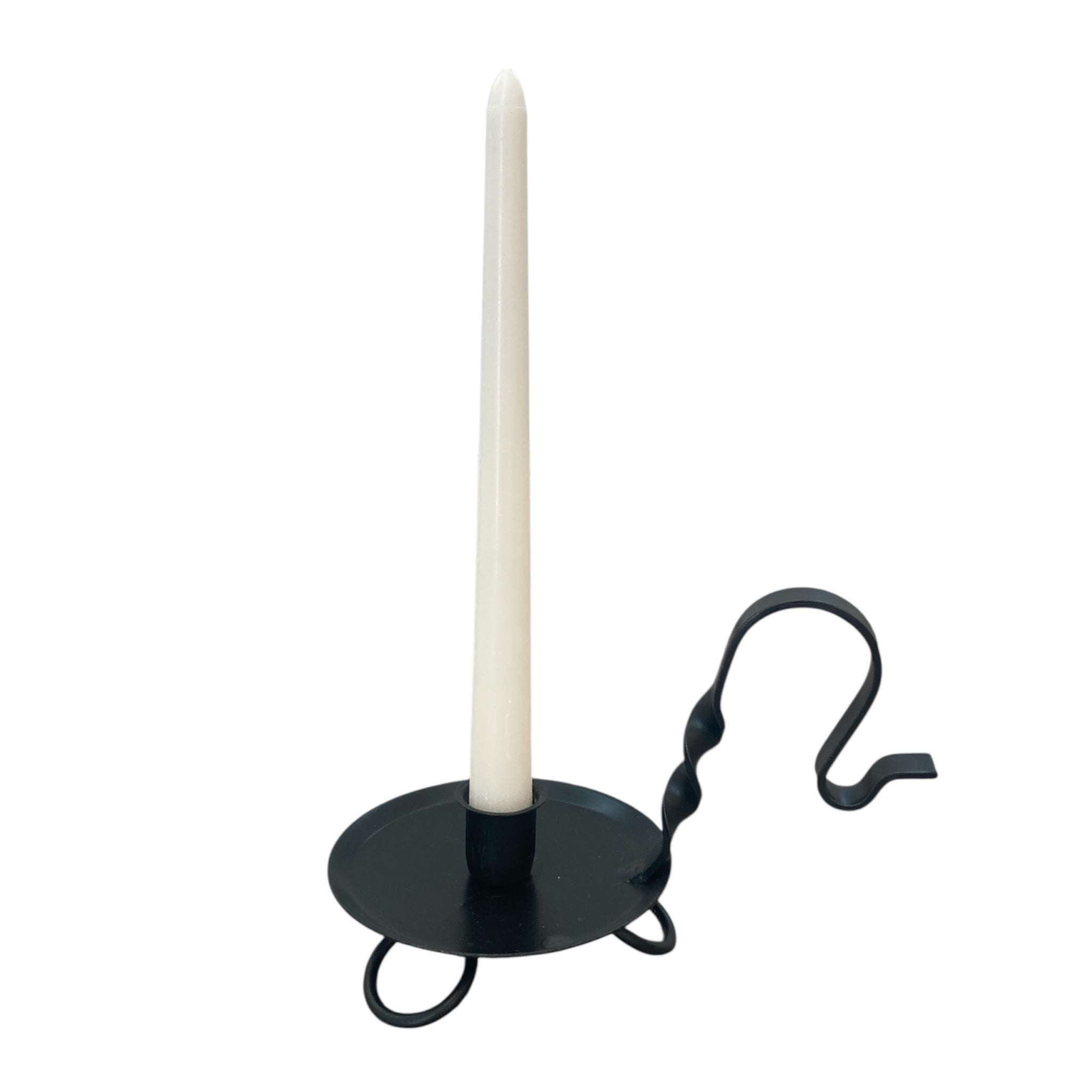 Bring the warmth and simplicity of early American living into your home with this colonial primitive black wrought iron taper candle holder, handcrafted by Amish artisans in Lancaster County, Pennsylvania.