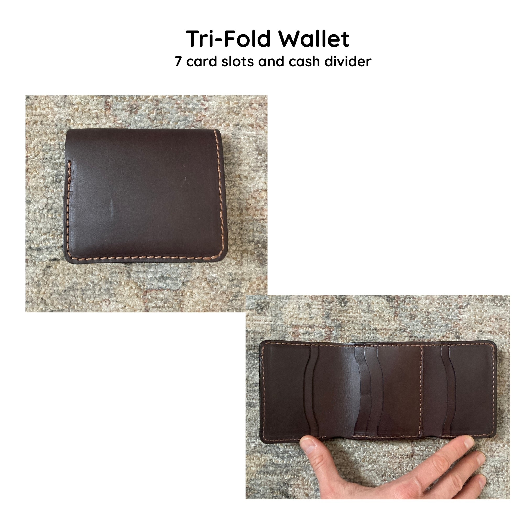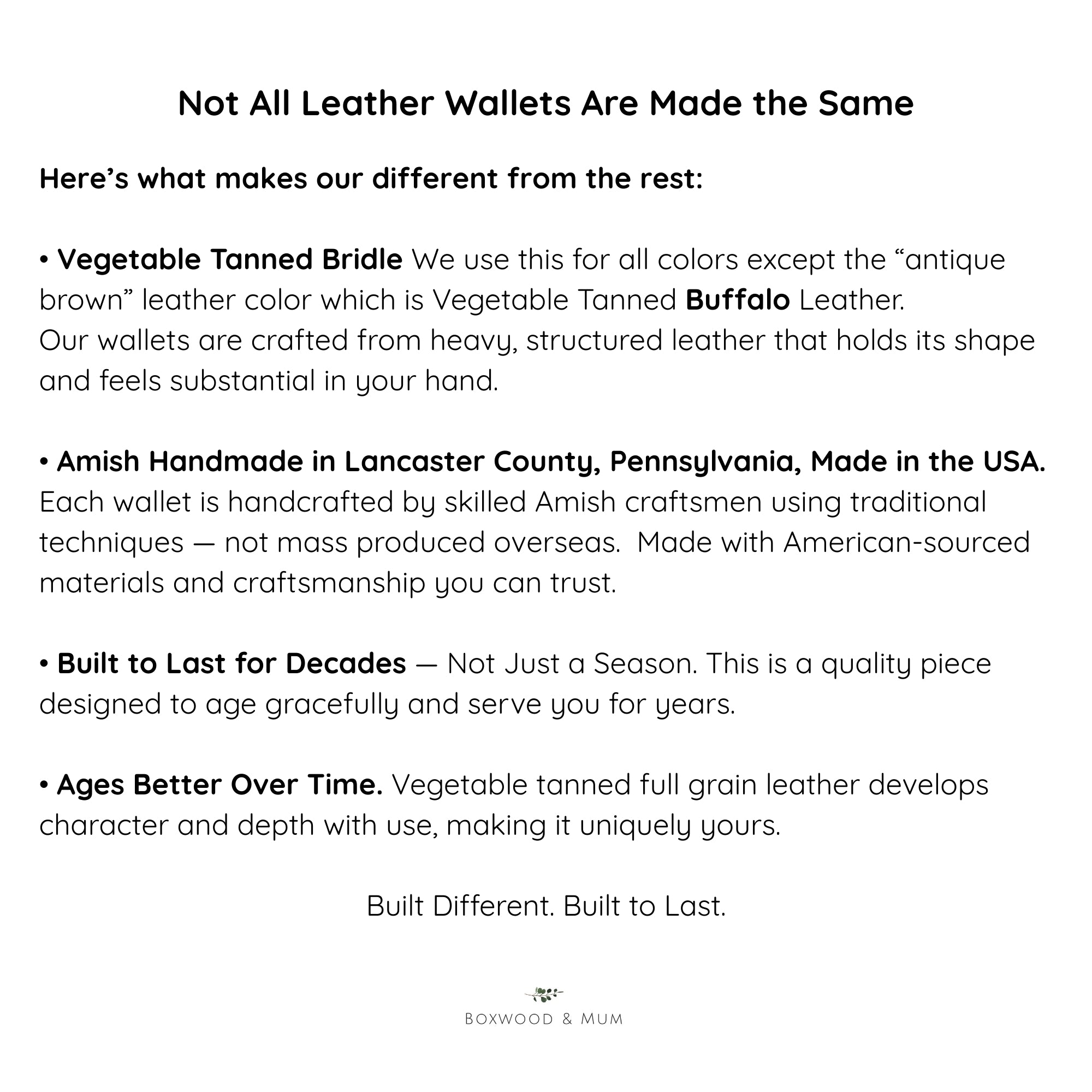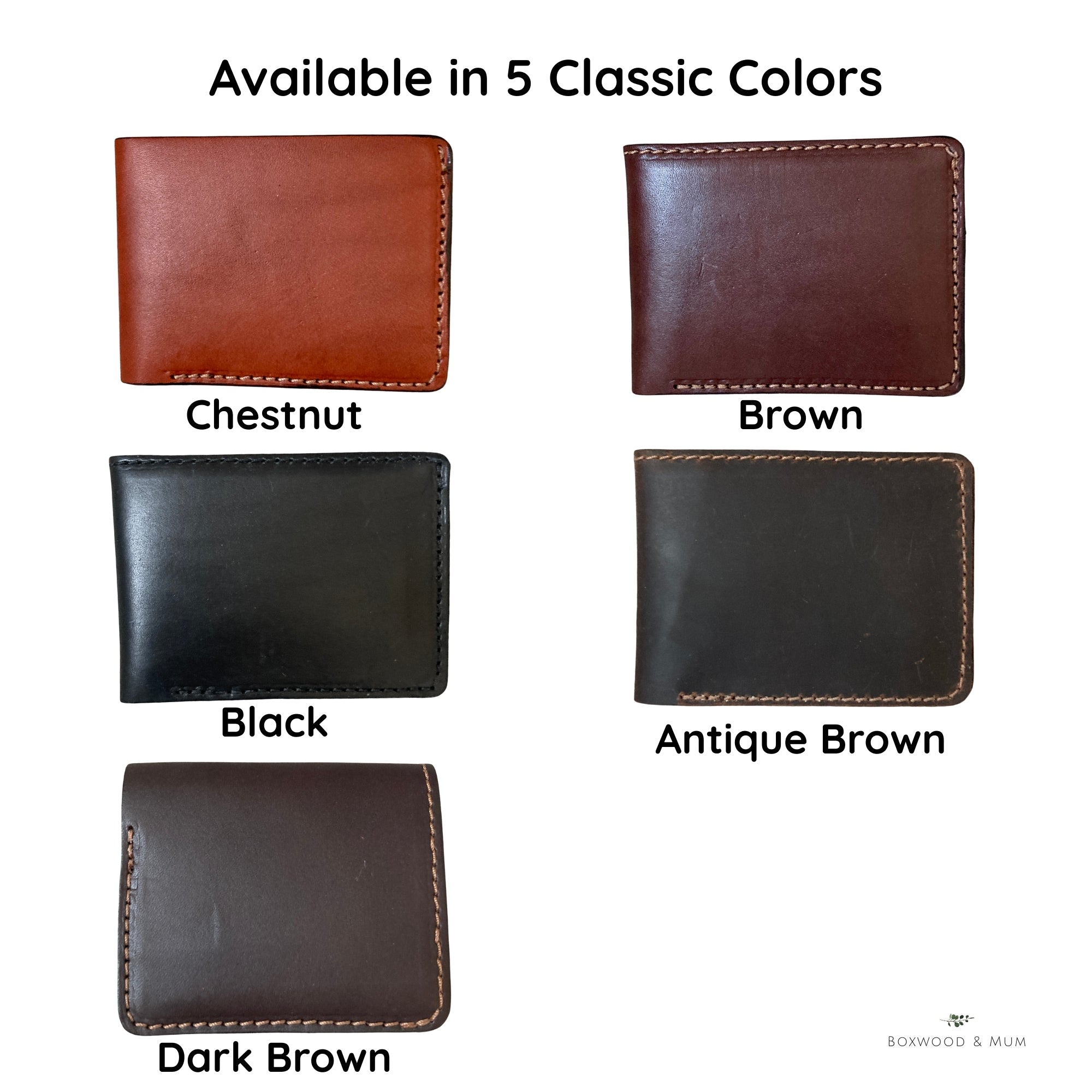 *Please note that the vegetable tanned bridle leather is used for all leather wallets except the "antique brown" color which is high quality vegetable tanned Buffalo leather (not bridle leather like the other leather colors).